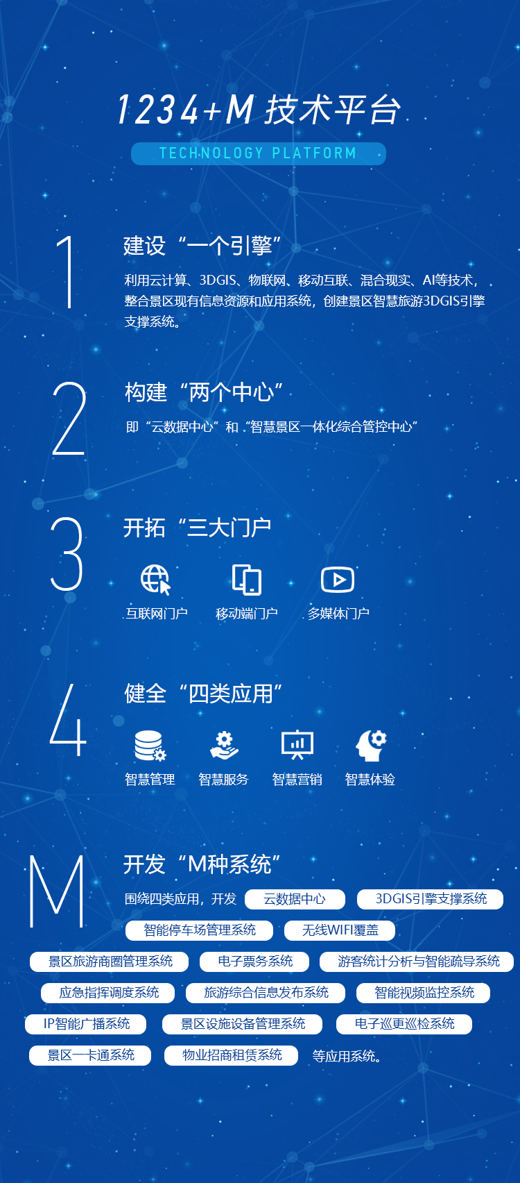 云野科技結(jié)合多年智慧景區(qū)建設(shè)經(jīng)驗及自身研發(fā)的成熟產(chǎn)品,緊緊圍繞“智慧管理、智慧服務(wù)、智慧營銷與智慧體驗”四類應(yīng)用,通過“1234+M”技術(shù)平臺的實(shí)施,實(shí)現(xiàn)景區(qū)智慧旅游建設(shè)目標(biāo)。