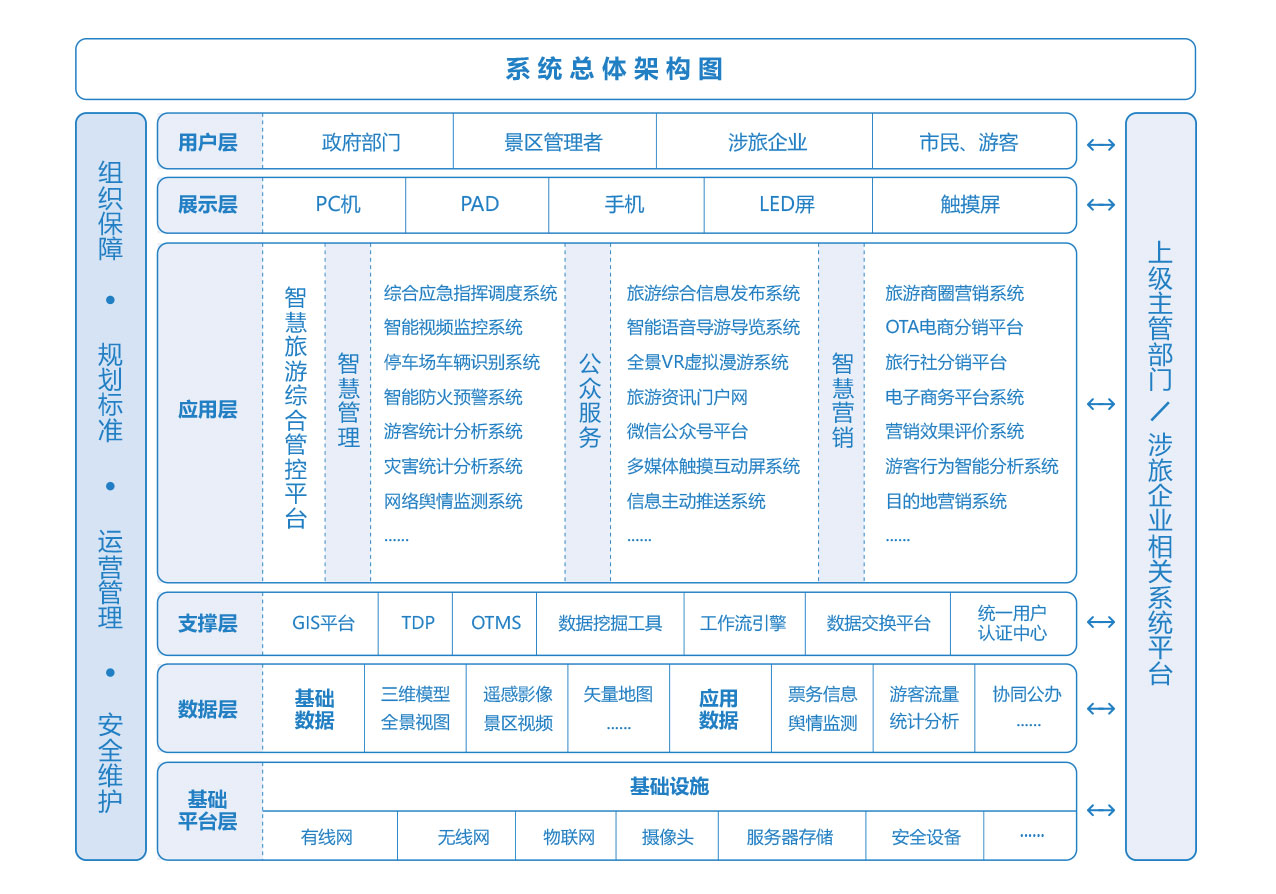 以云數(shù)據(jù)中心平臺為基礎(chǔ),以地理信息GIS平臺為支撐,以組織保障、標(biāo)準(zhǔn)規(guī)范、運(yùn)維管理與安全保障為后盾,從綜合管理、游客服務(wù)與旅游營銷三大層面入手,采用互聯(lián)共享、融合提升和科學(xué)管理的先進(jìn)設(shè)計理念,逐步建立起特色鮮明、運(yùn)轉(zhuǎn)高效的智慧旅游管理體系、服務(wù)體系和營銷體系。