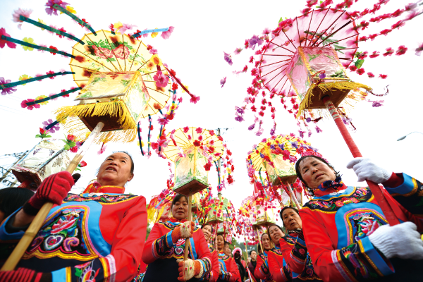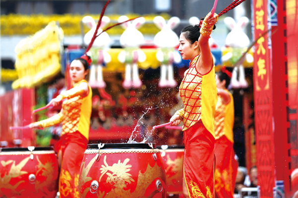 △ 2018年3月2日,幾位靚麗的女孩子在廣場上表演擊鼓。當日是中國傳統節日元宵節,數萬民眾來到西安大唐西市,熱鬧逛廟會、欣賞民俗表演。張遠攝