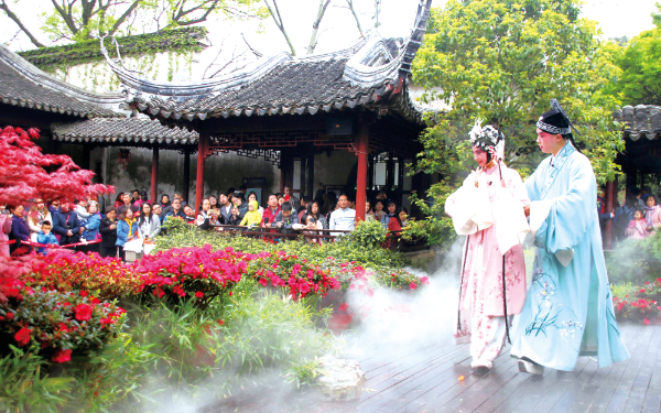 △ 2018年4月5日,2018“留園尋夢”吳文化特色游活動在蘇州古典園林留園啟動,昆曲、評彈、古琴等地方特色表演,向中外游客展現地方風情。王建康攝