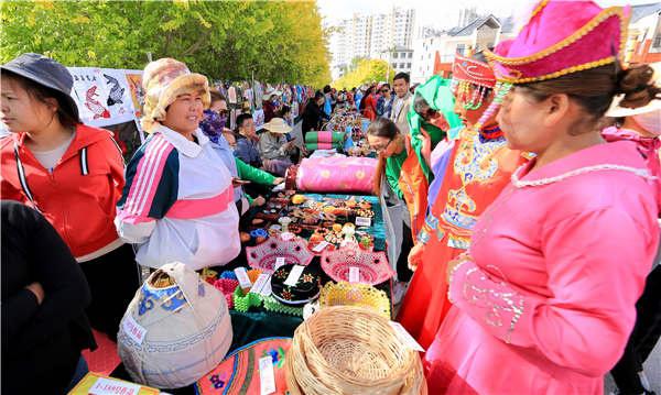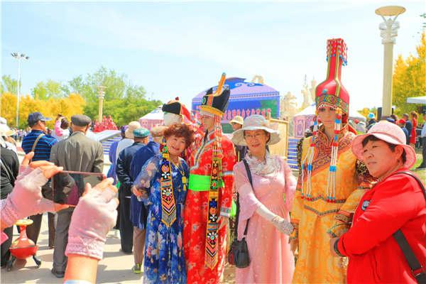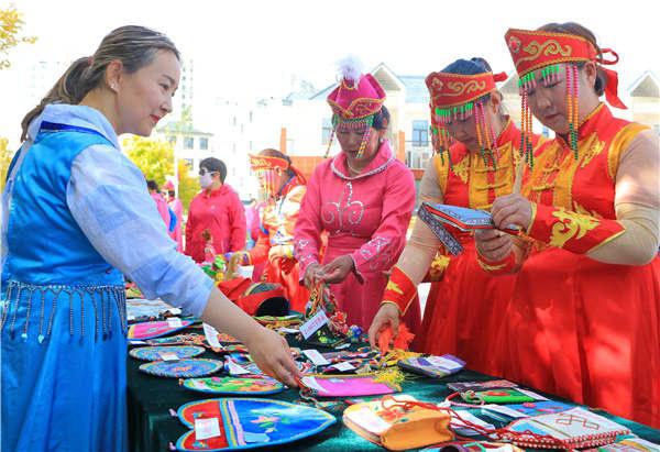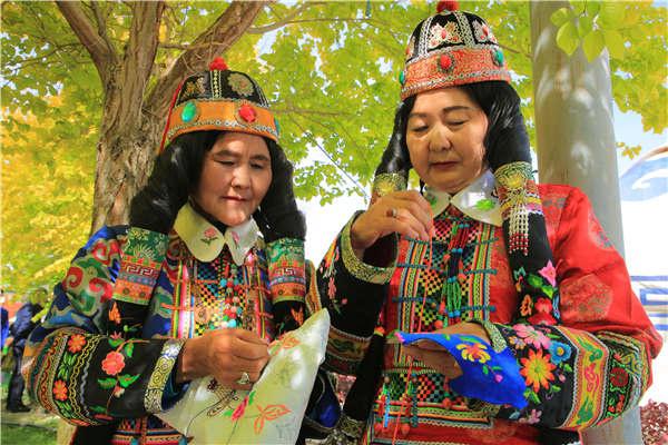 華麗的民族服飾,既能欣賞又能體驗(yàn),令在場游客們紛紛對博湖刺繡藝術(shù)之美夸贊不已,一些觀眾還興致勃勃地試穿刺繡蒙古族袍,用相機(jī)、手機(jī)定格下美好的瞬間。