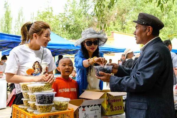 5月19日,游客在尉犁縣興平鎮(zhèn)哈拉洪村購(gòu)買(mǎi)當(dāng)?shù)赝撂禺a(chǎn)品。 □李飛攝