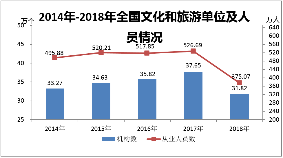 2018年末,納入統(tǒng)計(jì)范圍的全國(guó)各類文化和旅游單位31.82萬(wàn)個(gè),從業(yè)人員375.07萬(wàn)人。其中,各級(jí)文化和旅游部門(mén)所屬單位66835個(gè),增加91個(gè);從業(yè)人員67.06萬(wàn)人,增加0.34萬(wàn)人。