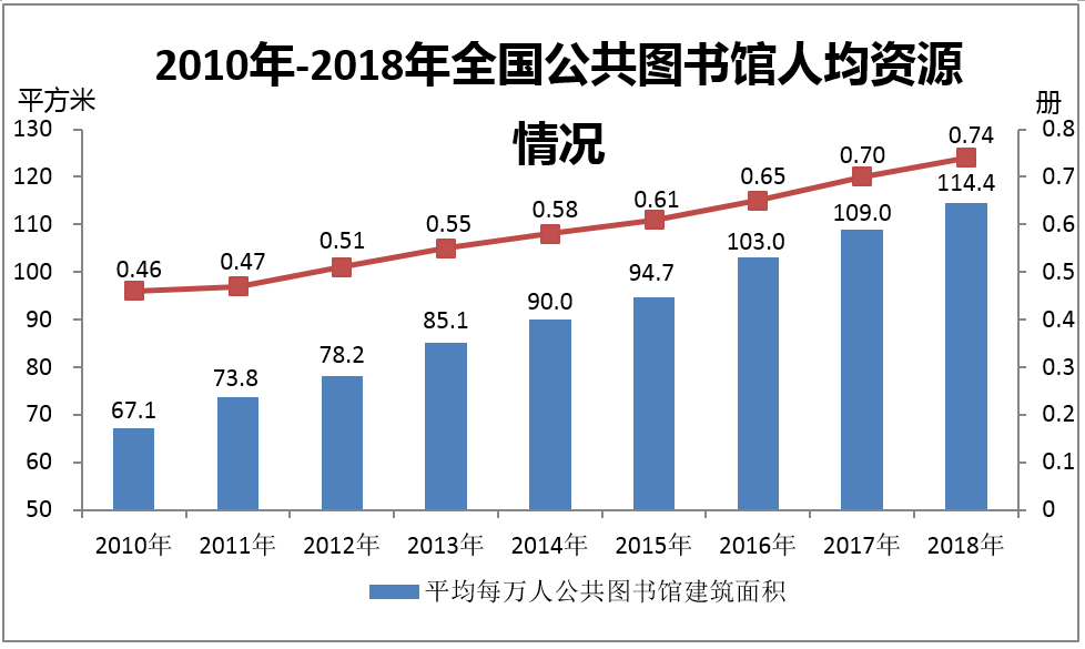 年末全國(guó)平均每萬(wàn)人公共圖書(shū)館建筑面積114.4平方米,比上年末增加5.4平方米;全國(guó)人均圖書(shū)藏量0.74冊(cè),比上年末增加0.04冊(cè);全年全國(guó)人均購(gòu)書(shū)費(fèi)1.77元,比上年末增加0.07元。