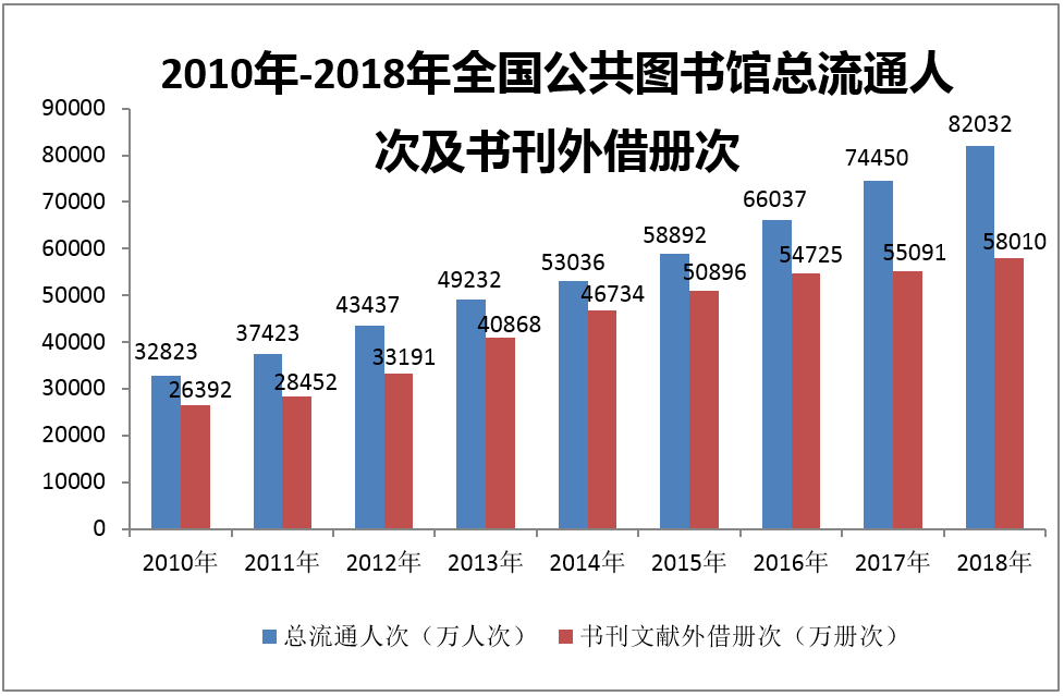 全年全國(guó)公共圖書(shū)館發(fā)放借書(shū)證7263萬(wàn)個(gè),比上年增長(zhǎng)7.8%;總流通人次82032萬(wàn),增長(zhǎng)10.2%。書(shū)刊文獻(xiàn)外借冊(cè)次58010萬(wàn),比上年增長(zhǎng)5.3%;外借人次25814萬(wàn),比上年增長(zhǎng)1.2%。全年共為讀者舉辦各種活動(dòng)179043次,比上年增長(zhǎng)15.1%;參加人次10648萬(wàn),比上年增長(zhǎng)20.2%。