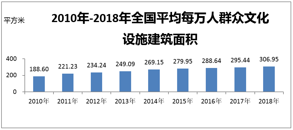 年末全國(guó)群眾文化機(jī)構(gòu)實(shí)際使用房屋建筑面積4283.09萬(wàn)平方米,比上年末增長(zhǎng)4.3%;業(yè)務(wù)用房面積3146.17萬(wàn)平方米,比上年末增長(zhǎng)5.7%。年末全國(guó)平均每萬(wàn)人群眾文化設(shè)施建筑面積306.95平方米,比上年末提高11.51平方米。