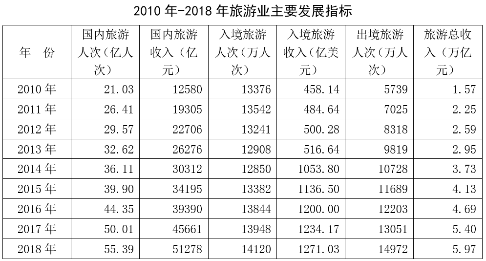 2018年國(guó)內(nèi)旅游市場(chǎng)持續(xù)平穩(wěn)增長(zhǎng),入境旅游市場(chǎng)穩(wěn)步進(jìn)入緩慢回升通道,出境旅游市場(chǎng)快速發(fā)展。全年國(guó)內(nèi)旅游人數(shù)55.39億人次,比上年同期增長(zhǎng)10.8%;入境旅游人數(shù)14120萬(wàn)人次,比上年同期增長(zhǎng)1.2%;出境旅游人數(shù)14972萬(wàn)人次,比上年同期增長(zhǎng)14.7%;全年實(shí)現(xiàn)旅游總收入5.97萬(wàn)億元,同比增長(zhǎng)10.5%。