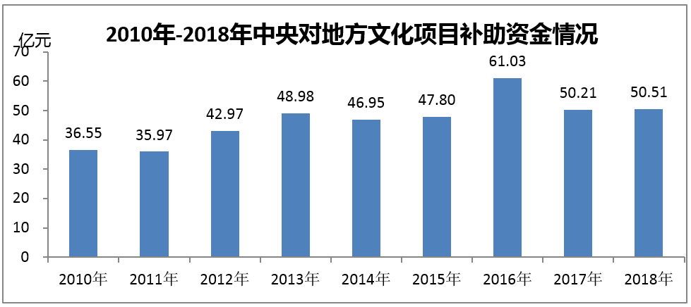 2018年,中央財(cái)政通過(guò)繼續(xù)實(shí)施“三館一站”免費(fèi)開(kāi)放、非物質(zhì)文化遺產(chǎn)保護(hù)、公共數(shù)字文化建設(shè)等文化項(xiàng)目,共落實(shí)中央補(bǔ)助地方文化專項(xiàng)資金50.51億元,比上年增長(zhǎng)0.6%。
