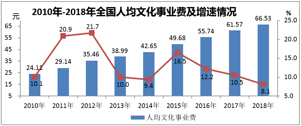 全年全國(guó)文化事業(yè)費(fèi)928.33億元,比上年增加72.53億元,增長(zhǎng)8.5%;全國(guó)人均文化事業(yè)費(fèi)66.53元,比上年增加4.96元,增長(zhǎng)8.1%。