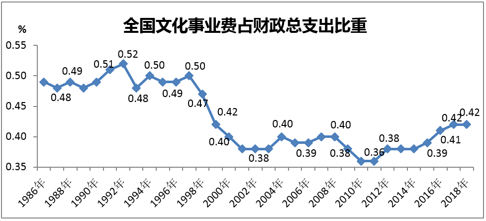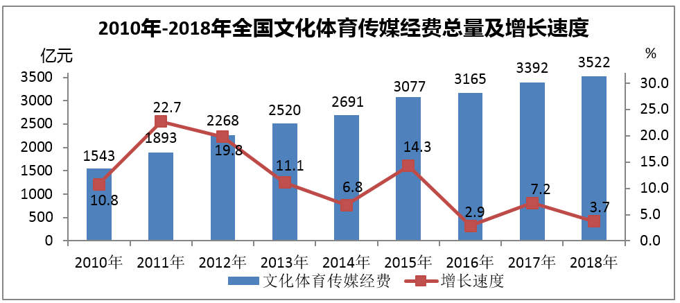 據(jù)財(cái)政部統(tǒng)計(jì),2018年全國(guó)財(cái)政支出中,文化體育傳媒經(jīng)費(fèi)3522億元,比上年增長(zhǎng)3.7%,占財(cái)政支出的1.59%,比重比上年下降0.07個(gè)百分點(diǎn)。