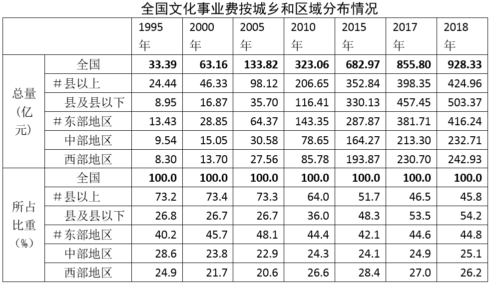 全國(guó)文化事業(yè)費(fèi)中,縣以上文化單位424.96億元,占45.8%,比重比上年降低了0.7個(gè)百分點(diǎn);縣及縣以下文化單位文化事業(yè)費(fèi)503.37億元,占54.2%,比重比上年提高了0.7個(gè)百分點(diǎn)。東部地區(qū)文化單位文化事業(yè)費(fèi)416.24億元,占44.8%,比重提高了0.2個(gè)百分點(diǎn);中部地區(qū)文化單位文化事業(yè)費(fèi)232.71億元,占25.1%,比重提高了0.2個(gè)百分點(diǎn);西部地區(qū)文化單位文化事業(yè)費(fèi)242.93億元,占26.2%,比重下降了0.8個(gè)百分點(diǎn)。