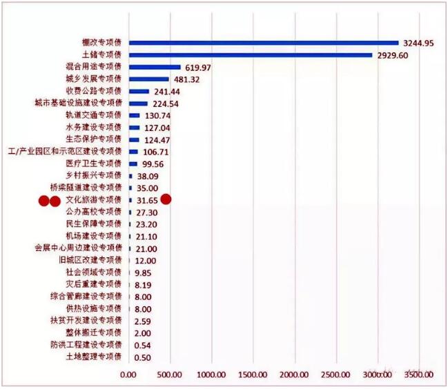 從今年1—5月新增專項債發行的品種和投向看,不難會發現在27類新增專項債品種中,棚改專項債超越土儲專項債以3244.95億元高居首位,其次是土儲專項債2929.60億元、城鄉發展專項債481.32億元、收費公路專項債241.44億元。而用于文化旅游專項債31.65億元,位居第14位(見圖5)。這充分說明了,文化旅游作為地方政府專項債重點項目已經成為不爭的事實。