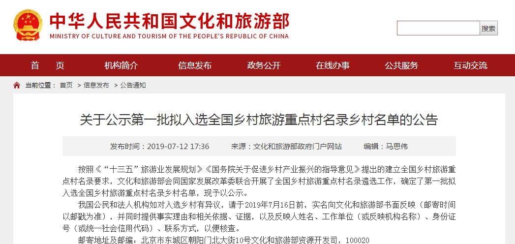 我國公民和法人機構(gòu)如對入選鄉(xiāng)村有異議,請于2019年7月16日前,實名向文化和旅游部書面反映(郵寄時間以郵戳為準(zhǔn)),并同時提供事實理由和相關(guān)依據(jù)、證據(jù),以及反映人姓名、工作單位(或反映機構(gòu)名稱)、身份證號(或統(tǒng)一社會信用代碼)、聯(lián)系方式,以便核查。