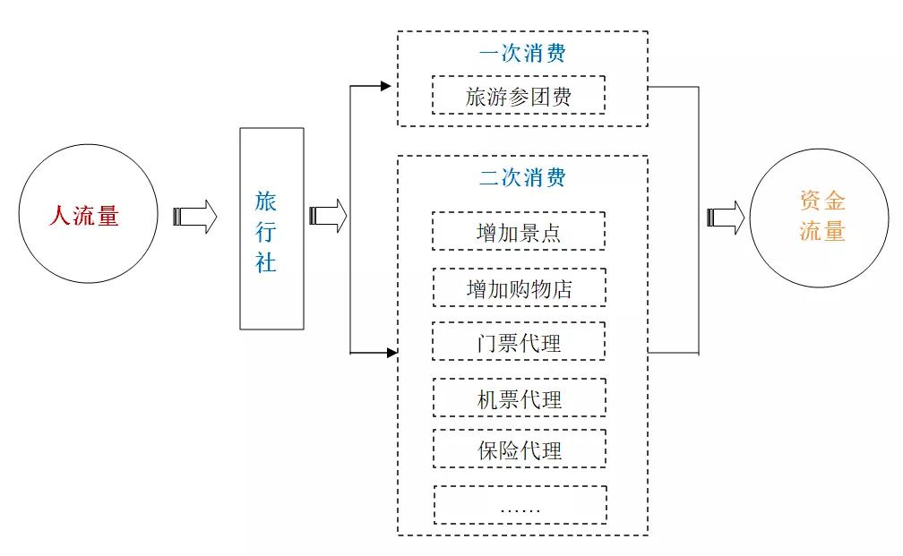 旅行社將散亂分布的人組成團隊,然后通過人流量轉化為資金流量的一次消費就是旅游參團費,簡稱團費,實現旅行社的基本資金的流動。團費主要是針對團隊旅游而推出的消費,將旅游行程以團隊的形式,包含了旅游交通費用、旅游門票費用、旅游餐飲費用、旅游住宿費用。旅行社只有通過收取團費,才能夠成功的將進入到旅行社的人流量轉化為資金流量,因此團隊旅游是旅行社發展的根本,旅行社的團隊游人流量是旅行社的生存根本。