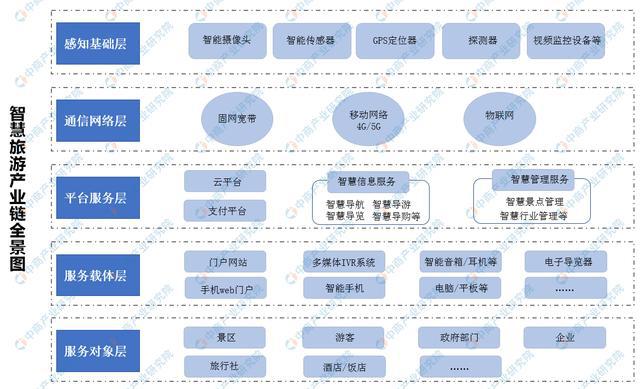 智慧旅游產(chǎn)業(yè)鏈所涉及的環(huán)節(jié)復雜、行業(yè)眾多,大大超出了傳統(tǒng)旅游行業(yè)的范疇。從結(jié)構(gòu)來看,智慧旅游產(chǎn)業(yè)鏈中既有水平供需關系,也存在垂直協(xié)作關系。同時,隨著技術的不斷提升、需求更新,持續(xù)不斷有新的企業(yè)進入產(chǎn)業(yè)鏈。中商產(chǎn)業(yè)研究院整理了我國智慧旅游產(chǎn)業(yè)鏈圖主要包括:感知基礎層、通信網(wǎng)絡層、平臺服務層、服務載體層以及服務對象層五大層面,如下圖所示: