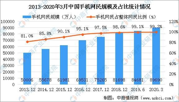 截至2020年3月,我國手機網(wǎng)民規(guī)模為8.97億,較2018年底新增手機網(wǎng)民7992萬,網(wǎng)民中使用手機上網(wǎng)的比例為99.3%,較2018年底提升0.7個百分點。