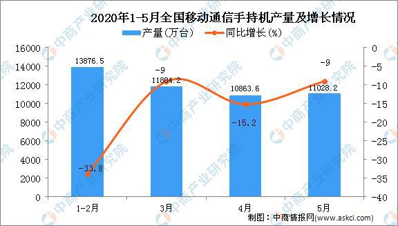 據(jù)中商產(chǎn)業(yè)研究院數(shù)據(jù)庫顯示,2020年5月全國移動通信手持機產(chǎn)量下降,2020年5月全國移動通信手持機產(chǎn)量為11028.2萬臺,同比下降9%。2020年1-5月全國移動通信手持機產(chǎn)量為46323.9萬臺,同比下降16.5%。