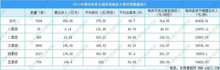 根據(jù)文化和旅游部數(shù)據(jù)顯示,到2019年第四季度,全國星級飯店統(tǒng)計管理系統(tǒng)中共有星級飯店10130家。共有7434家星級飯店通過省級文化和旅游行政部門審核,其中包括一星級25家,二星級988家,三星級3565家,四星級2117家,五星級739家。
