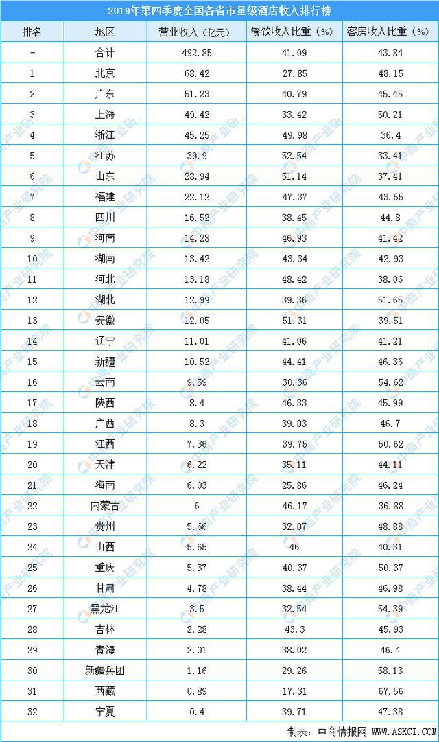 從2019第四季度各地區(qū)星級酒店經(jīng)營情況看,共有2個地區(qū)營收超50億元,分別是北京68.42億元,其中餐飲收入占比27.85%,客房收入占比48.15%;廣東521.23億元排名第二。上海市195家星級酒店實現(xiàn)營業(yè)收入49.42億元,排名第三。另外,全國共有15個地區(qū)營收超10億元。