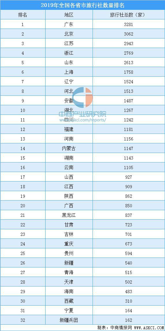 從全國旅行社分布來看,東部地區(qū)和西部地區(qū)旅行社數(shù)量較多,合計占全國旅行社總量超70%。旅行社數(shù)量在2500家以上的有5個地區(qū),分別為廣東、北京、江蘇、浙江和山東,數(shù)量最多的廣東為3281家。海南、西藏、寧夏、新疆兵團4個地區(qū)旅行社數(shù)量少于500家,最少的新疆兵團為162家。旅行社數(shù)量在500-1000家的有12個地區(qū),1000-1500家的有8個地區(qū),1500-2000家的有3個地區(qū)。2019年全國各省市旅行社數(shù)量排名如下:
