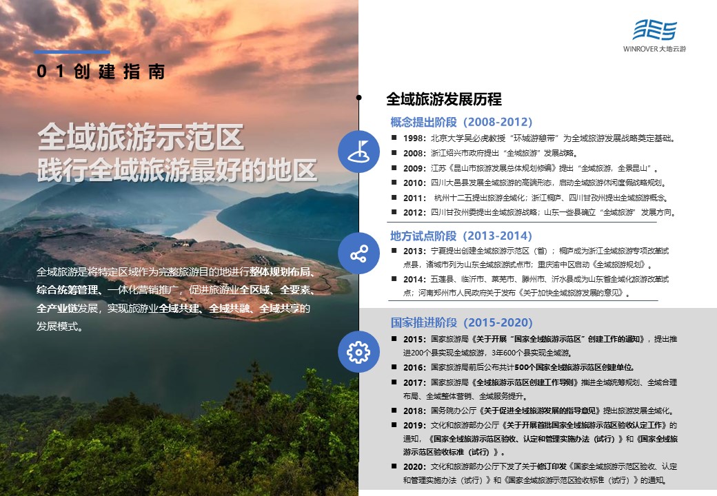 2016年2月,國家旅游局公布了首批國家全域旅游示范區創建名錄,共計262個;11月,國家旅游局公布了第二批國家全域旅游示范區創建名錄,共計238個。其中,海南省被確定為首個全域旅游創建省。