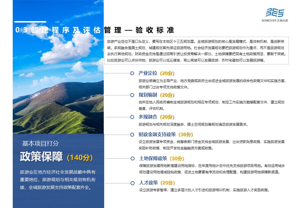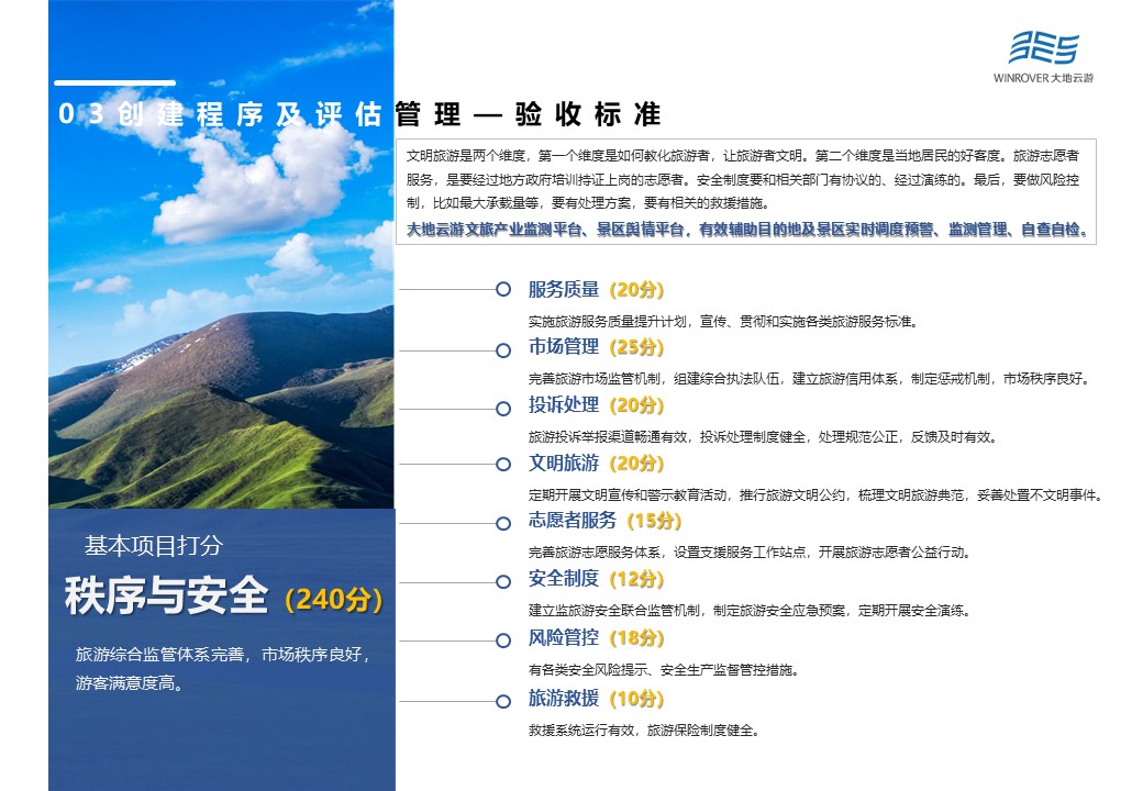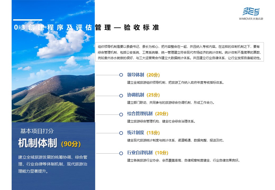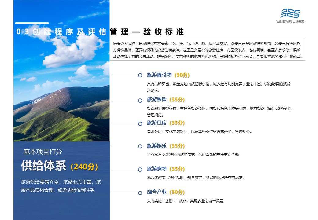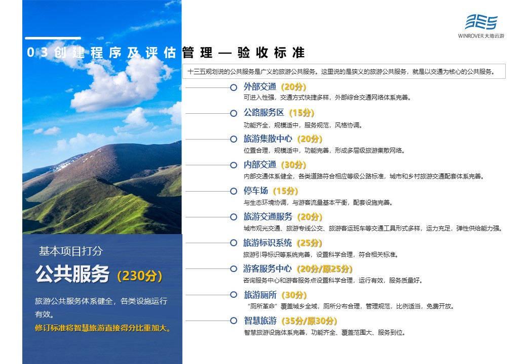 其中,基本打分項目主要由機制體制(90分)、政策保障(140分)、公共服務(230分)、供給體系(240分)、秩序與安全(240分)、資源與環境(100分)、品牌影響(60分)等7大項構成。根據最新修訂結果,將公共服務中游客服務中心的25分,降為20分,同時加大智慧旅游分數占比,將原本的30分,提升為35分。