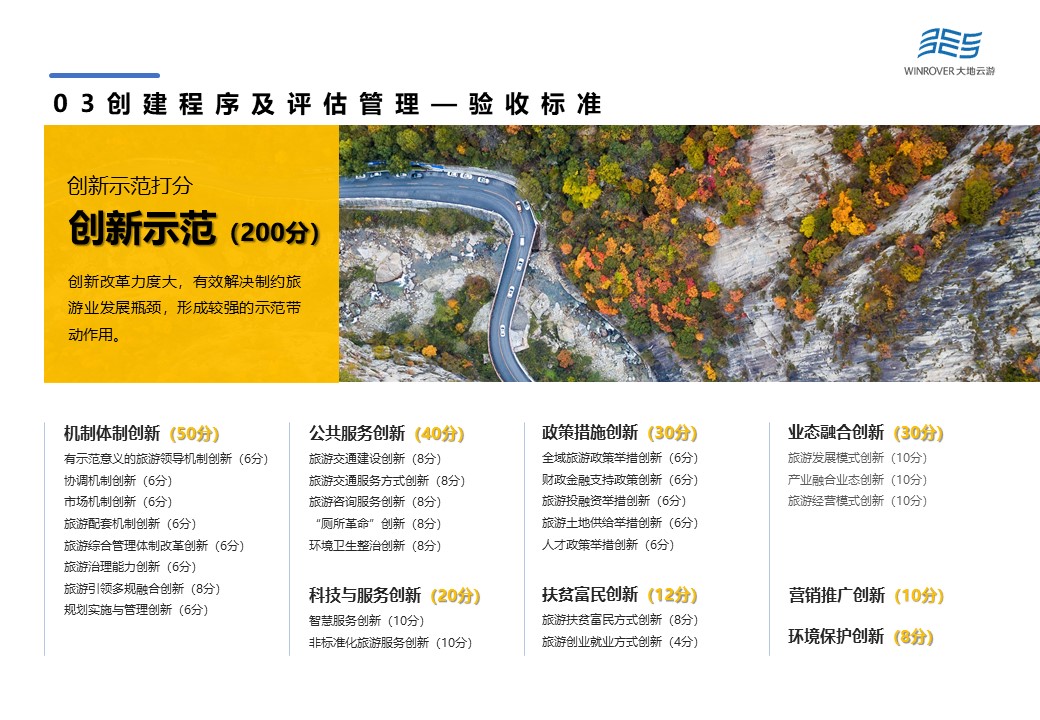 創新示范項目由機制體制創新(50分)、公共服務創新(40分)、科技與服務創新(20分)、政策措施創新(30分)、扶貧富民創新(12分)、業態融合創新(30分)、營銷推廣創新(10分)以及環境保護創新(8分)等8項構成。創新改革力度大,有效解決制約旅游業發展瓶頸,形成較強的示范帶動作用,是驗收得分的重點。