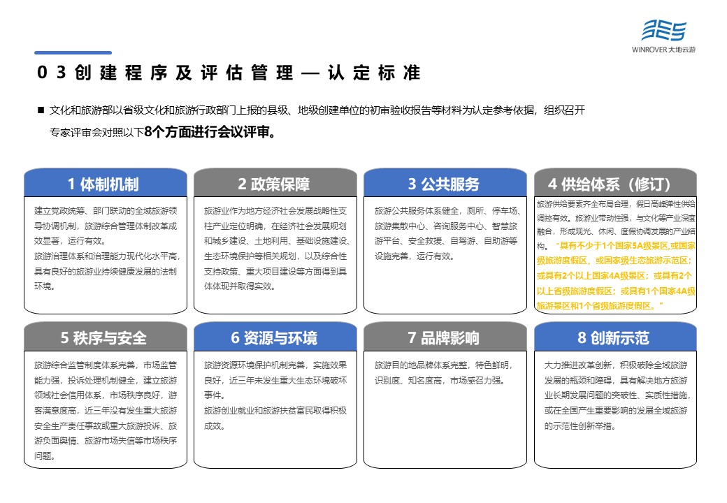 文化和旅游部以省級文化和旅游行政部門上報的縣級、地級創建單位的初審驗收報告等材料為認定參考依據,組織召開專家評審會對體制機制、政策保障、公共服務、供給體系、秩序與安全、資源與環境、品牌影響以及創新示范等8個方面進行會議評審。根據最新修訂結果,認定標準在供給體系方面進行了適當“放寬”,將“具有不少于1個國家5A級旅游景區,或國家級旅游度假區,或國家級生態旅游示范區;或具有2個以上國家4A級旅游景區”修改為“具有不少于1個國家5A級景區,或國家級旅游度假區,或國家級生態旅游示范區;或具有2個以上國家4A級景區;或具有2個以上省級旅游度假區;或具有1個國家4A級旅游景區和1個省級旅游度假區。”