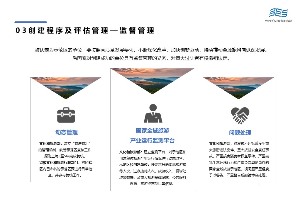 國家全域旅游示范區采用“有進有出”的動態管理機制,原則上每3至5年完成復核。被認定為示范區的單位,要按照高質量發展要求,不斷深化改革,加快創新驅動,持續推動全域旅游向縱深發展,否則對重大過失者有權撤銷認定。