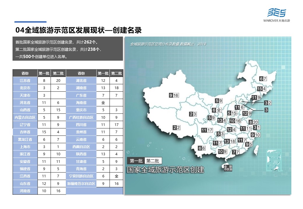 2019年上半年,全國32個省級文化和旅游行政部門報送96家單位。9月4日,文化和旅游部公示了首批共71家國家全域旅游示范區名單,大陸32個省市自治區均有1-3家全域旅游示范區。