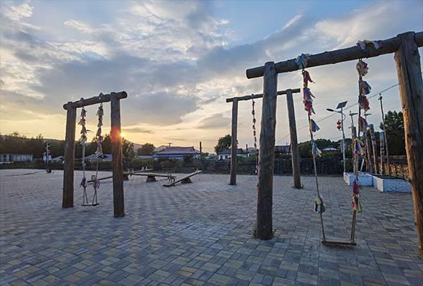 漸漸駛離延吉西站,窗外的稻田郁郁蔥蔥,一叢叢青磚黛瓦的朝鮮族民居鑲嵌在延綿起伏的山巒之間。車(chē)子離開(kāi)公路,駛?cè)胍粭l蜿蜒曲折的鄉(xiāng)路,路旁的住房多了起來(lái),裊裊炊煙也開(kāi)始生動(dòng)具體,我們慢慢進(jìn)入了龍井市。