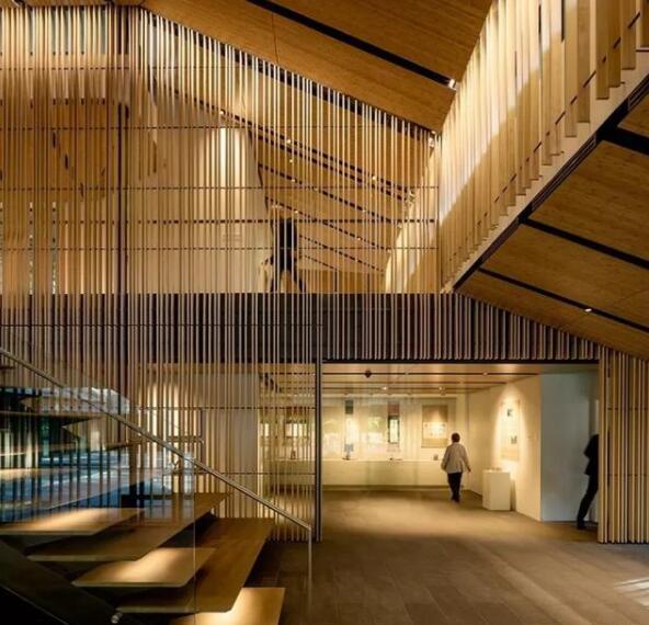 建筑層高低矮,主要材料是鋼和玻璃,立面和內(nèi)部裝飾大部分采用當?shù)啬静模c環(huán)境完美協(xié)調(diào)。室內(nèi)景觀,隈研吾也以自己一貫的風(fēng)格做了設(shè)計:若有似無的空間隔斷、視野開闊的大面落地窗、簡潔但充滿細節(jié)的空間布局。