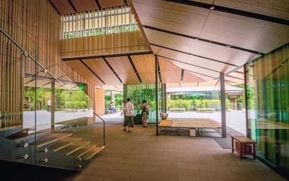 文化村于2017年4月2日正式對外開放,作為一處擴建工程,其位于花園大門外面并通往花園。隈研吾利用山林間和室內(nèi)空間的高低落差,做了循序漸進的引導(dǎo)設(shè)計。參觀者可以舒服有序地進入園林,不會在偌大的空間里暈頭轉(zhuǎn)向。