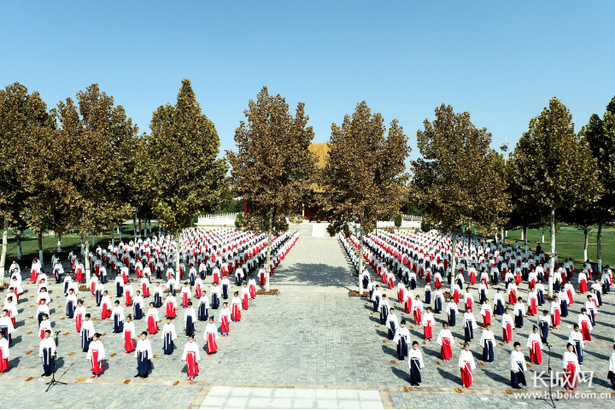 600名小學生身著漢服,在廣川學宮大殿廣場上誦讀《董子名言》。