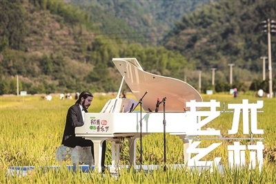 今年10月,百江鎮聯盟村的村民坐在豐收的稻田里與各地游客一起欣賞了一場“國際范”的音樂節,遠處稻浪翻滾,近處是悠揚的歌聲,錯落在田間的是畫家們凝神作畫的場景。