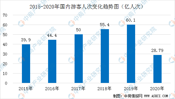 旅游業是提高人民生活水平的重要產業,近幾年,我國旅游人數及旅游收入快速增長。旅游人數由2015年的39.9億人次增至2019年的60.1億人次。受新型冠狀病毒肺炎疫情影響,2020年度國內旅游人數28.79億人次,比上年同期減少30.22億人次,下降52.1%。其中,城鎮居民出游20.65億人次,下降53.8%;農村居民出游8.14億人次,下降47.0%。