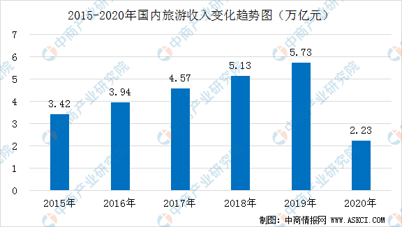 旅游收入數由2015年的3.42萬億元增至2019年的5.73萬億元。2020年國內旅游收入2.23萬億元,比上年同期減少3.50萬億元,下降61.1%。其中,城鎮居民出游花費1.80萬億元,下降62.2%;農村居民出游花費0.43萬億元,下降55.7%。據中國旅游研究院發布的《2021年第一季度旅游經濟運行分析與上半年趨勢預測》,國內旅游收入0.56萬億元,同比增長150%。