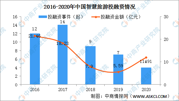 2017年以來,我國智慧旅游投融資事件持續減少,2020年受疫情影響,旅游業受重挫,智慧旅游投融資事件僅4起,投融資金額11.91億元,同比增長113.06%。智慧旅游領域投融資更為謹慎,資本青睞較為成熟的項目。