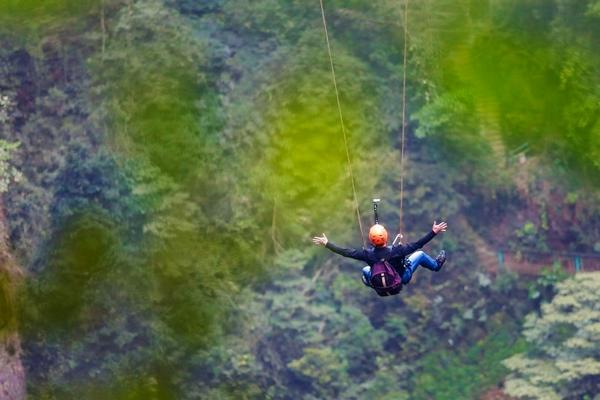 支持鼓勵支持猴耳天坑、南江大峽谷等景區景點引進叢林穿越、飛拉達、超級大秋千、云中漫步等山地戶外項目,不斷豐富旅游業態。值得一提的是,作為全國第一個以極限運動為核心的主題景區,猴耳天坑極限酷玩公園集天坑、峭壁、暗河、飛瀑于一體,融奇、險、秘、幽于一爐,游客可在此體驗超級網紅大秋千、索道攀巖、洞穴探險等驚險刺激的戶外體育旅游休閑項目。