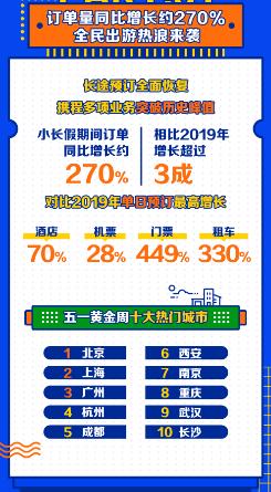 今年五一連休五天,消費者積蓄已久的長途出行需求得以釋放。來自攜程方面數據顯示,攜程五一假期總訂單量同比增長約270%,對比2019年同期增幅超過30%。酒店、門票、租車、機票四項業務單日訂單量最高增幅分別為:70%、449%、330%、28%。