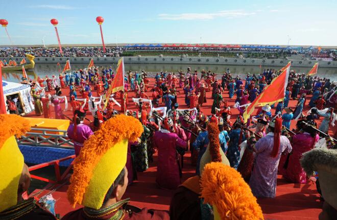 在新疆博湖縣博斯騰湖大河口景區,非遺傳承人和民間藝人們共同表演蒙古族短調民歌。
