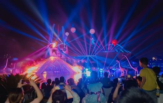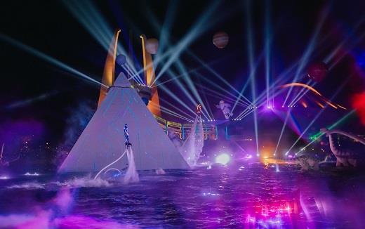 去年7月1日,恐龍園大型沉浸式夜游項目D秀首演。夜幕下的恐龍園,日常隱于水底的一座“金字塔”緩緩升起,“金字塔”以4K投影漆為表面,遍布智能光路系統,夜間自帶360°科幻流光效果,并搭載了10個脈沖點火噴射裝置,應用“明火不著”的特殊生物脂油,破水而出后,仍可呈現8米高的火焰噴射、氣爆效果。此外,恐龍園還為D秀原創了長達8分鐘影視效果,設計了侏羅紀森林、神秘深海、冰封地球等七大場景,其中僅一段數十秒鐘的河流瀑布的超長鏡頭,就細膩地呈現出湍急的河流、壯觀的瀑布、慘烈的災難等震撼特效。