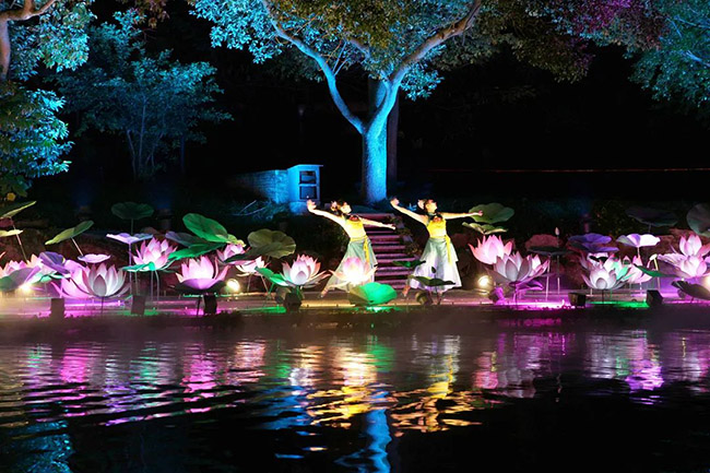 不遠處,“詩畫山水,溫潤之州”八個大字在南塘中瑞橋上閃亮呈現。兩岸場景中演員傾情演繹不同主題,河上低吟淺唱與水景交相輝映,勾勒出一幅幅時尚夢幻的詩畫山水畫面,一個個流光溢彩的塘河人文故事,給游客帶來一場光影交錯、音畫相融的視聽盛宴。