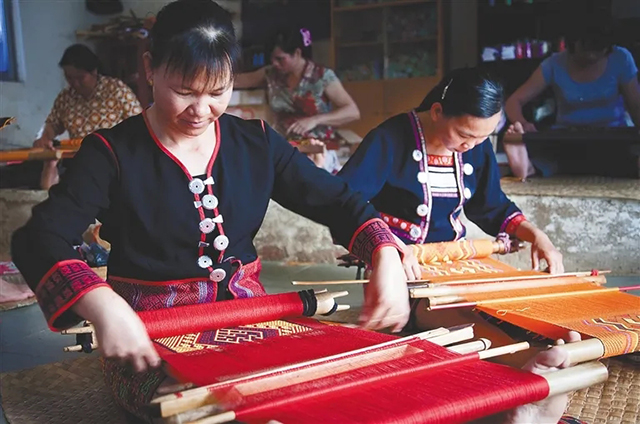 如今在當地,越來越多的農村婦女轉變成“織娘”,通過織黎錦增收。截至2021年底,五指山市共有黎錦技藝非遺工坊6家,每家工坊團隊人員最多60人、最少30人,平均每家吸納貧困戶15人,銷售額從幾十萬元到上百萬元,有效推動鄉村振興。