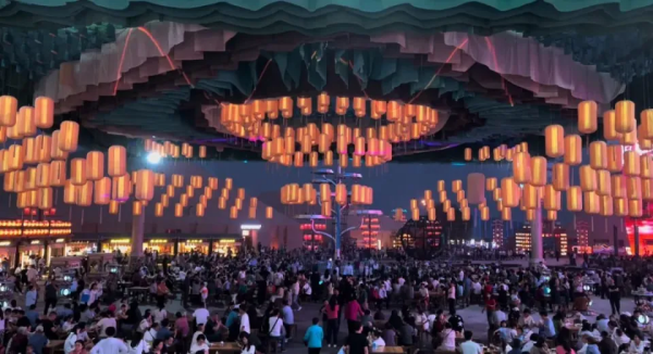 迦陵頻伽是古希臘、古印度、中亞與中國本土文化元素交融互鑒的最佳例證之一,生動闡釋了敦煌文化兼收并蓄、寬容博大的品格。設(shè)計者將迦陵頻伽與燈輪圖像元素相組合,大唐盛世的感覺瞬間拉滿,再加上漢唐街、西域街和市集廣場設(shè)立的云闕飛仙牌樓、賓至疊瀑、云闕仙宮等特色景觀,讓人在動靜斑斕間沉浸式體驗傳統(tǒng)文化與現(xiàn)代文化碰撞的極致魅力。