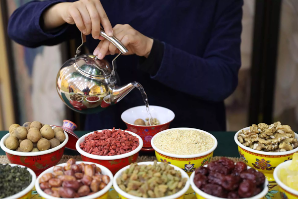 在早茶店不遠處,是一家名為“劉三朵”的八寶茶店。將玫瑰、芝麻、枸杞等八種食材按個人喜好抓到蓋碗里,再倒上沸水沖泡,燜一會兒,就是一碗香甜可口的八寶茶。茶喝到剩1/3時,再繼續加水慢品,直到茶湯變淡,過程頗為考究。吳忠八寶茶過去多次在國際性的博覽會上展出,受到不少外國友人的歡迎。