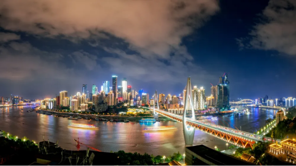體驗(yàn)山水之美,到“母城”渝中——“有山有水,大山大水,江峽相擁,山環(huán)水繞”,山形水勢、兩江圍合的半島氤氳出“江崖街洞天”獨(dú)樹一幟的城市風(fēng)貌。索道游動(dòng)著一城風(fēng)景,輪渡穿梭于悠悠江水,列車穿山越水、穿樓而過,“云端之眼”屹立藍(lán)天白云間。