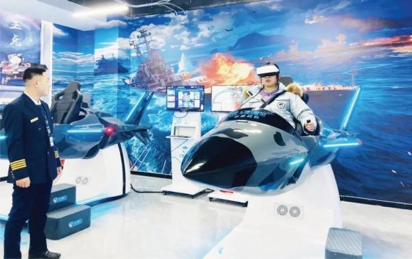 教育基地二樓,只見寬敞明亮的大廳內陳列著各種先進的模擬設備,環繞式的大屏幕,呈現出逼真的飛行場景,讓人仿佛置身于云端之上。這里有裸眼9D飛行影院,160°弧形大屏幕搭配六軸動感平臺,可模擬加速、俯沖、搖晃等動作,加入吹風、噴水、泡泡、雪花等特效,可以帶來視覺、聽覺、觸覺等全方位感官體驗。