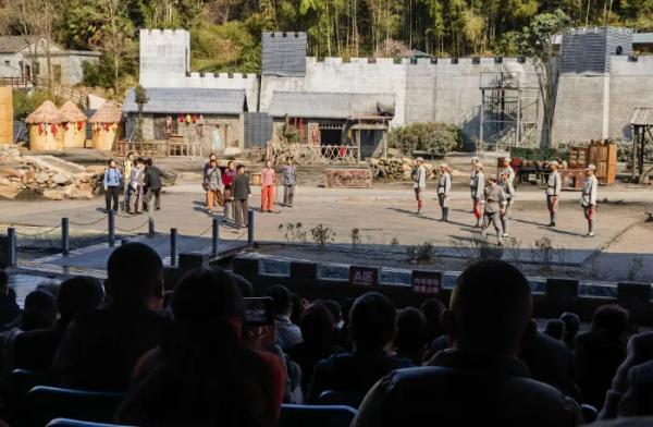 位于大別山腹地的安徽霍山縣落兒嶺鎮,寂靜春風掠過草木葳蕤的崖壁,峽谷里卻突然騰起硝煙,一陣陣激烈的槍炮聲在山谷間回蕩。這是大型實景劇《大別山傳奇》的演出現場。年輕游客白欣語說,置身現場,數十名戰士從山間無畏地沖向敵人時,感覺自己是在歷史中震顫的參與者。