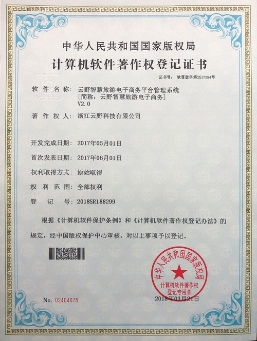 《云野智慧旅游電子商務平臺管理系統(tǒng)V2.0》于2018年3月21日被正式授予《中華人民共和國國家版權局計算機軟件著作權登記證書》,登記號為2018SR188299。